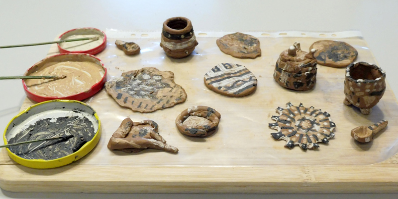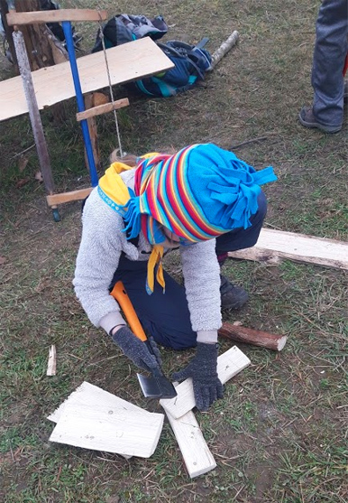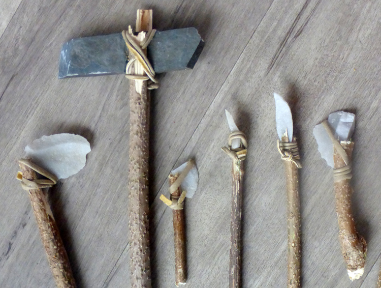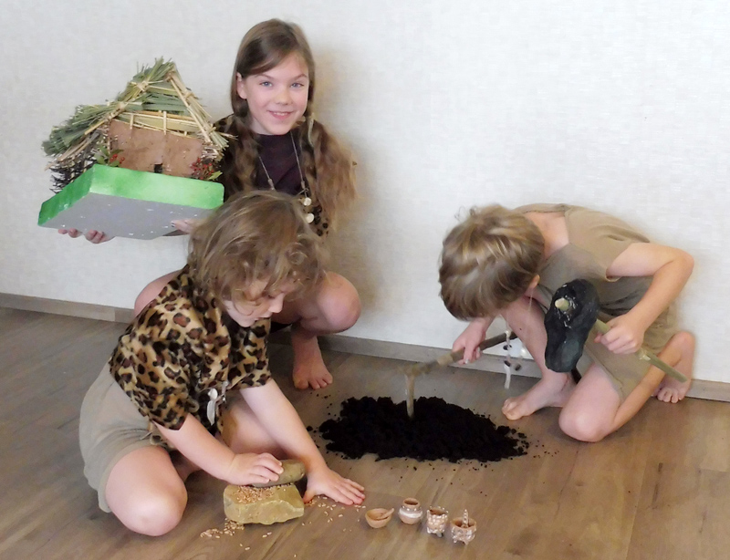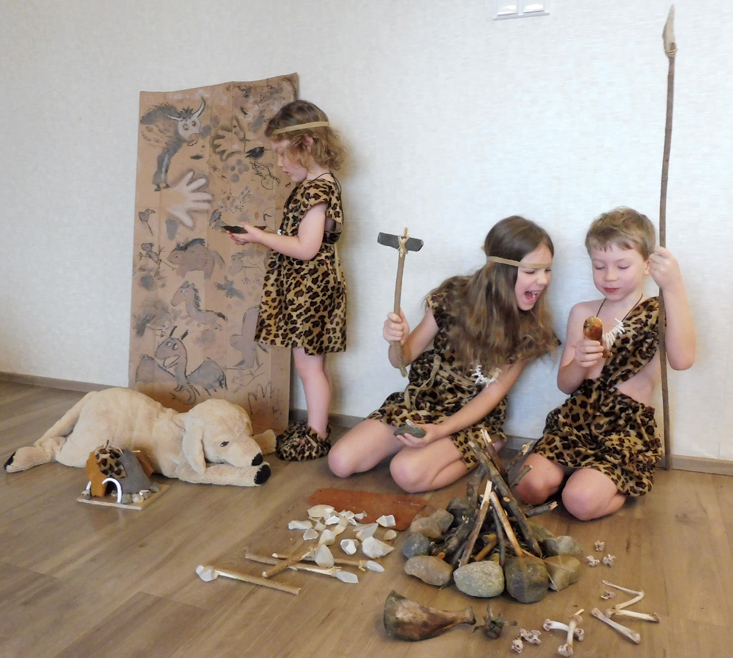 O pravěku se učíme tak, že děláme živé obrazy s pravěkými kostýmy, vlastnoručně vyrobenými nástroji (já jsem se o svůj nožík dokonce pořezala), miniaturním pravěkým domem a jinými věcmi. Já s Tomem máme i náhrdelníky ze zubů nebo jiné ozdoby. Tím, jak vyrábíme všechny ty věci, se o pravěku hezky poučíme. Také jezdíme na místa, kde byly nalezeny doklady o pobytu pralidí. Takhle jsme prozkoumali starší dobu kamennou, mladší dobu kamennou a teď děláme dobu bronzovou.